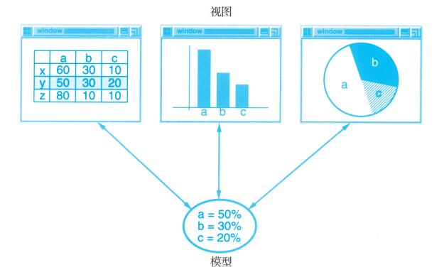 下图显示了一个模型和三个视图(为了简单起见我们省略了控制器)。模型包含一些数据值,视图通过电子表格、柱状图、饼图等不同的方式来显示这些数据。当模型的数据发生变化时,模型就通知它的视图,而视图将与模型通信以获取这些数据值。
