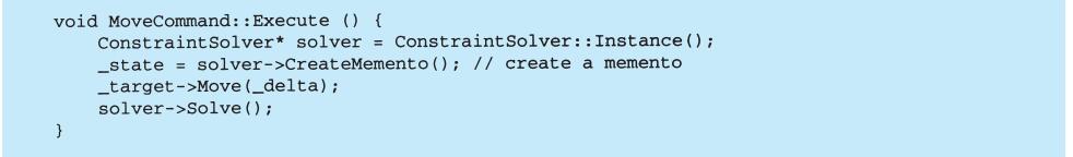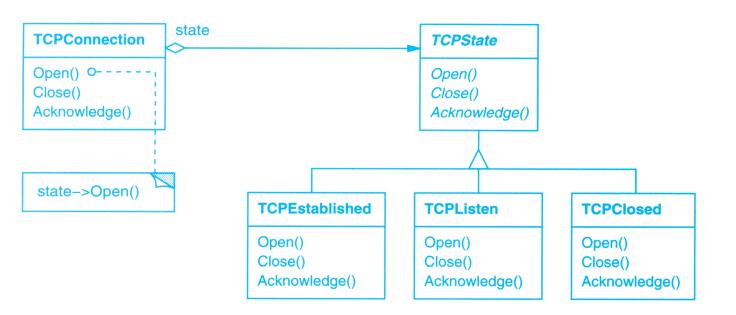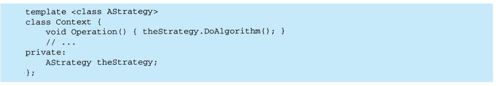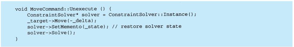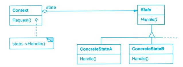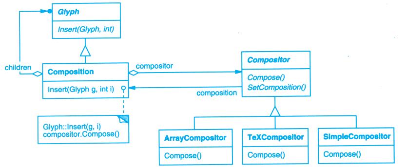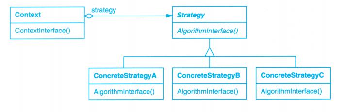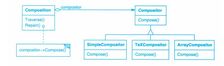 View-Controller关系是Strategy(5.9)模式的一个例子。一个策略是一个表述算法的对象。当你想静态或动态地替换一个算法,或你有很多不同的算法,或算法中包含你想封装的复杂数据结构时,策略模式是非常有用的。