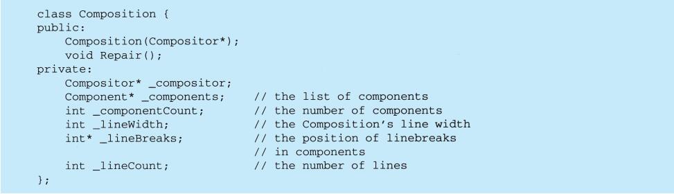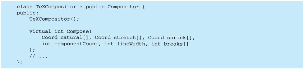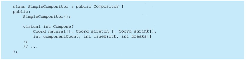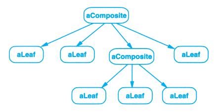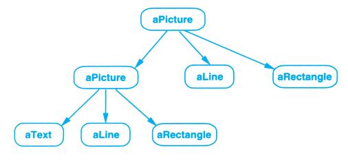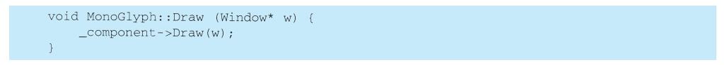 上例反映了可以将组合视图与其构件平等对待的设计,同样,该设计也适用于更一般的问题:将一些对象划为一组,并将该组对象当作一个对象来使用。这个设计被描述为Composite(4.3)模式,该模式允许你创建一个类层次结构,一些子类定义了原子对象(如Button)而其他类定义了组合对象(CompositeView),这些组合对象是由原子对象组合而成的更复杂的对象。