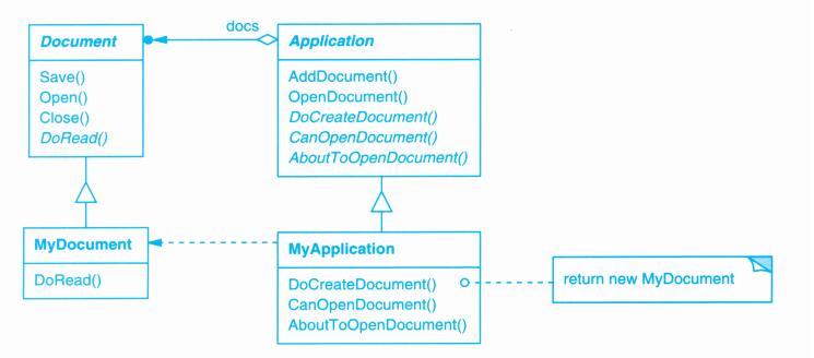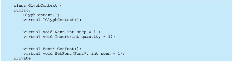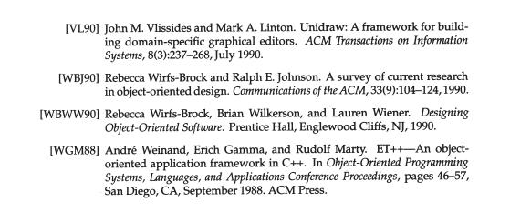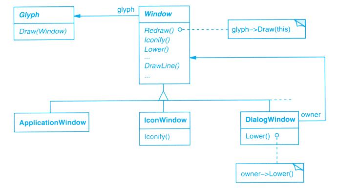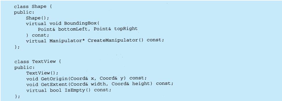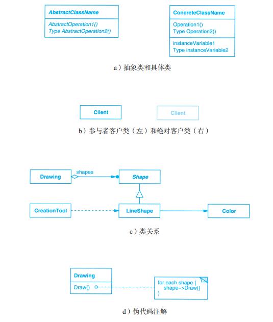 每个设计模式至少包含一个类图,需要时也使用其他图形表示来补充说明。类图和对象图是基于OMT(Object Modeling Technique)[RBP+91,Rum94]的[1]。交互图来自于Objectory[JCJO92]和Booch方法。