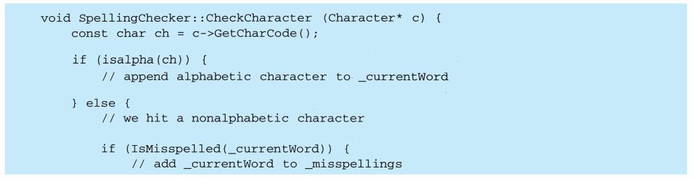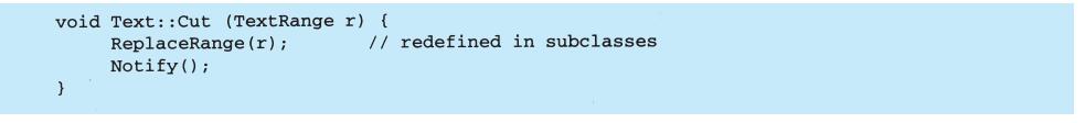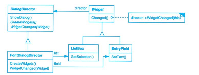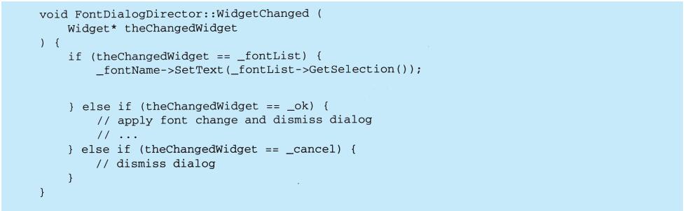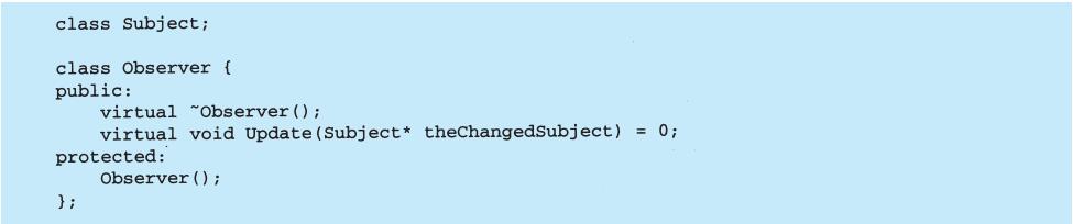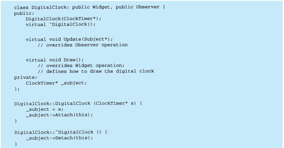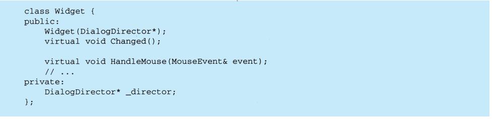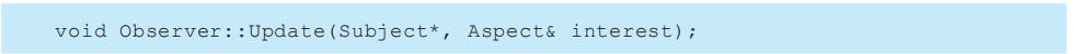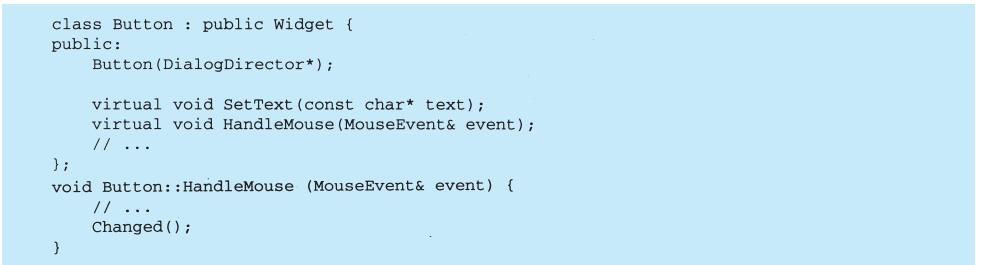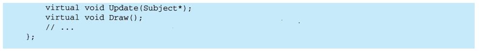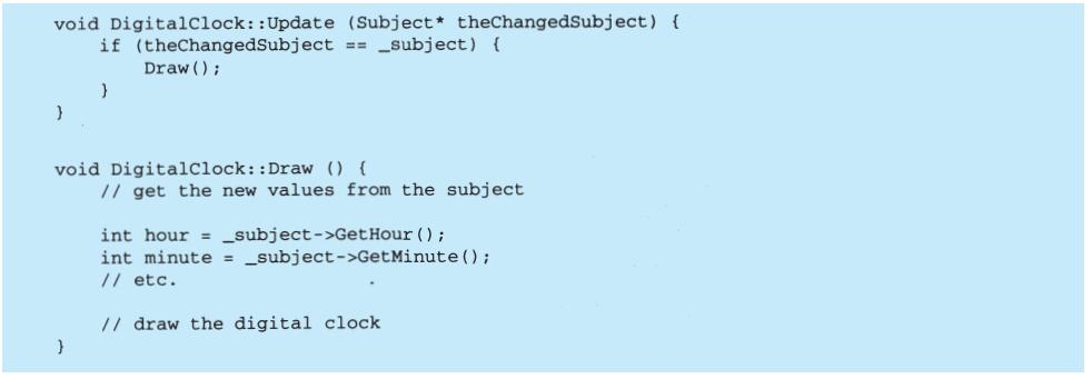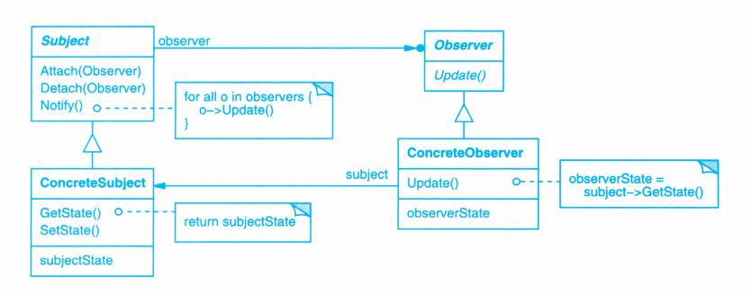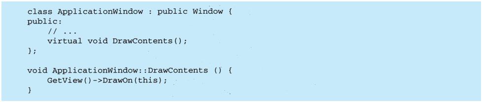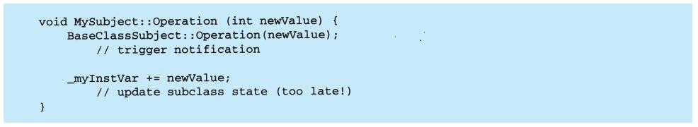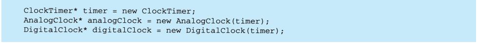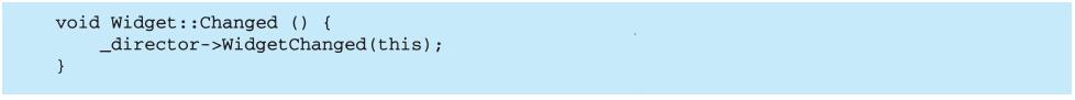 表面上看,这个例子反映了将视图和模型分离的设计,然而这个设计还可用于解决更一般的问题:将对象分离,使得一个对象的改变能够影响另一些对象,而这个对象并不需要知道那些被影响的对象的细节。这个更一般的设计被描述成Observer(5.7)模式。