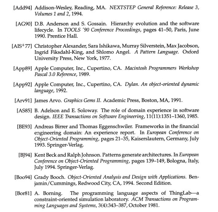 尽管本书涉及较多的内容,但书中讨论的设计模式仅仅包含了一个设计行家所知道的部分。书中没有讨论与并发、分布式或实时程序设计有关的模式,也没有收录面向特定应用领域的模式。本书并不准备告诉你怎样构造用户界面、怎样写设备驱动程序或怎样使用面向对象数据库,这些方面都有自己的模式,将这些模式分类编目也是件很有意义的事。