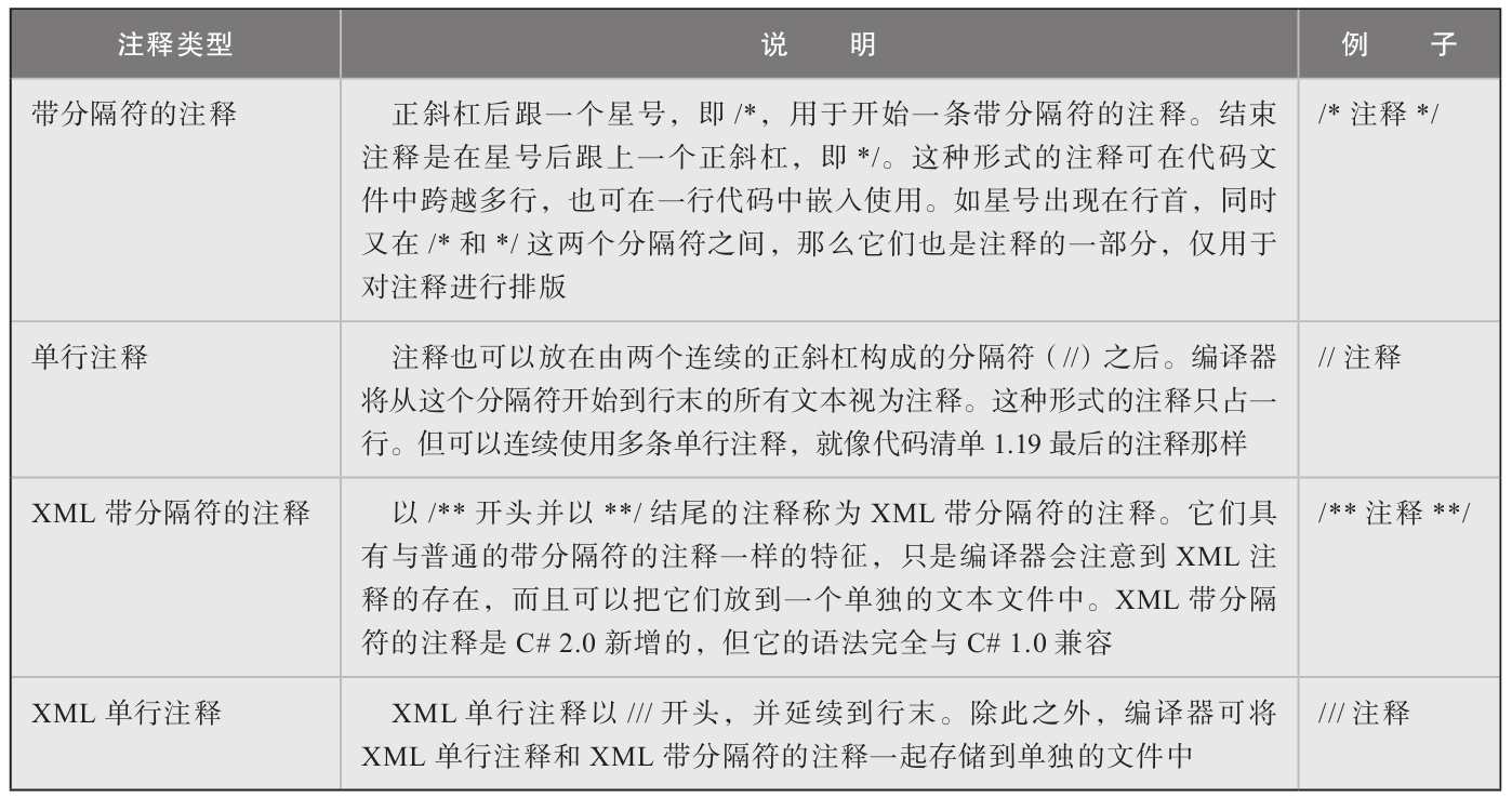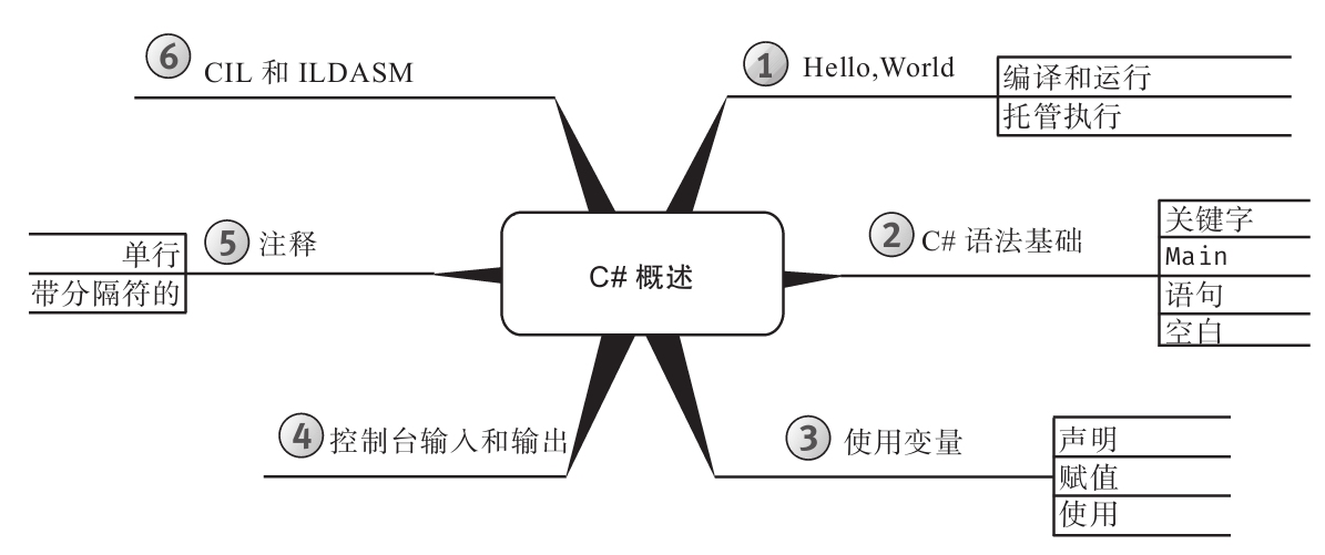 ·第1章 :本章在展示了用C#写的HelloWorld程序之后对其进行细致分析。目的是让读者熟悉C#程序的“外观和感觉”,并理解如何编译和调试自己的程序。另外,还简单描述执行C#程序的上下文及其中间语言(Intermediate Language,IL)。