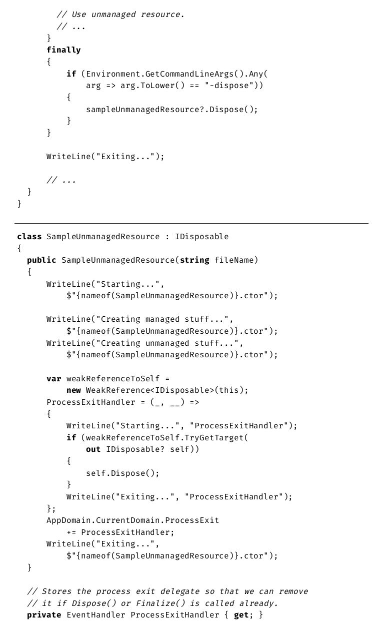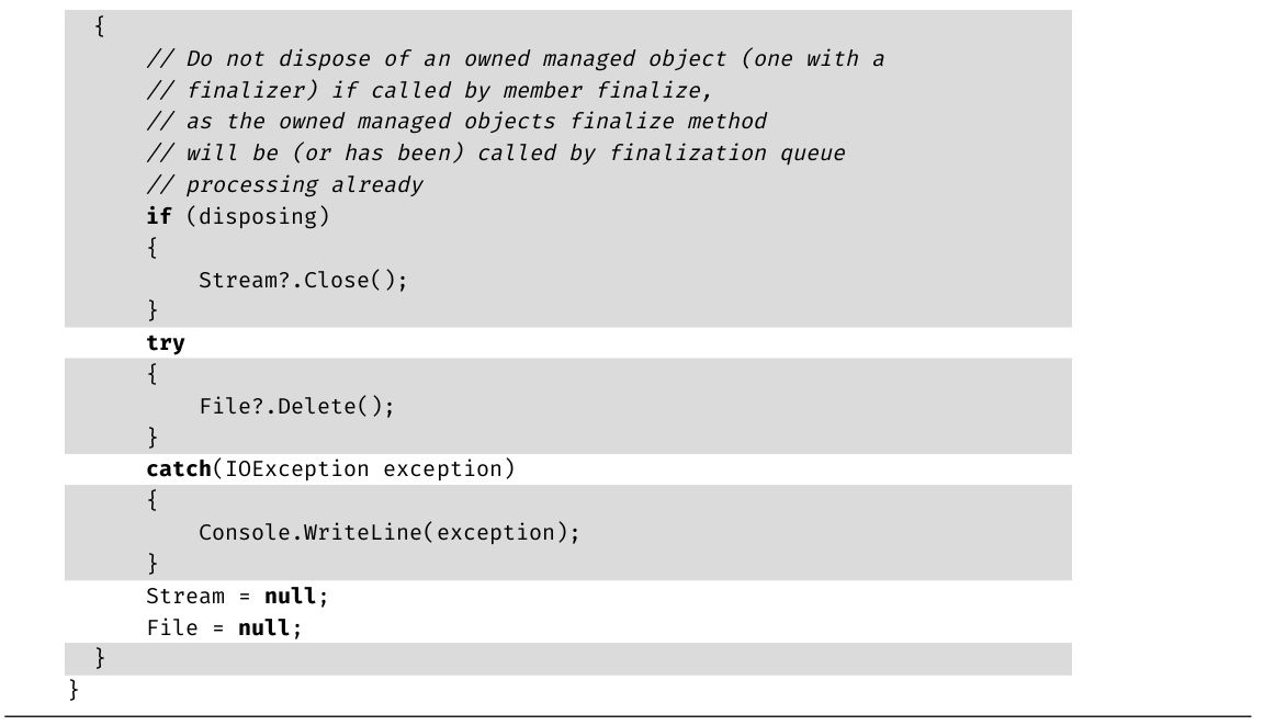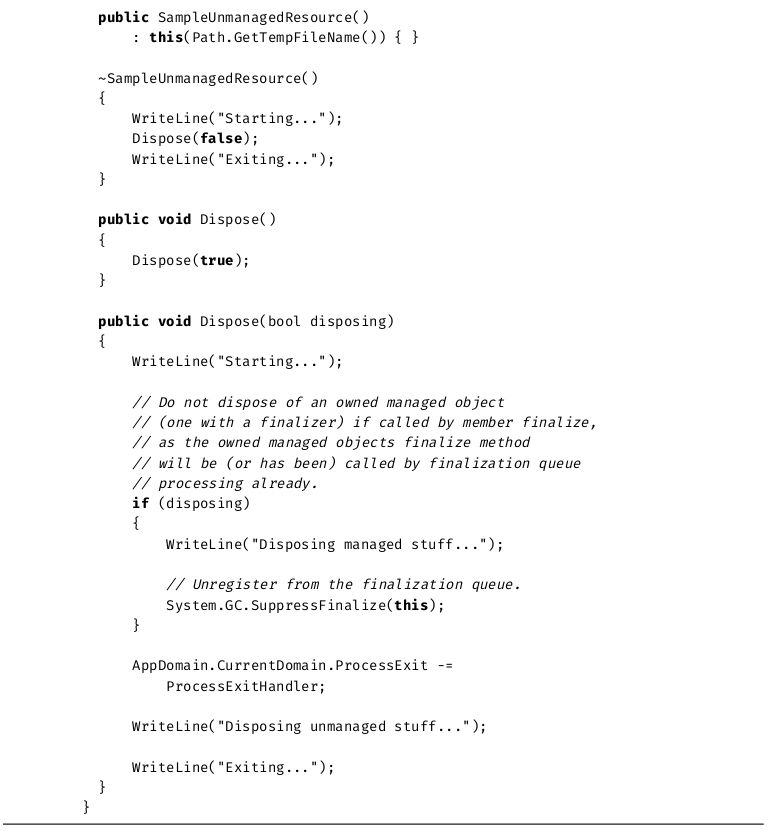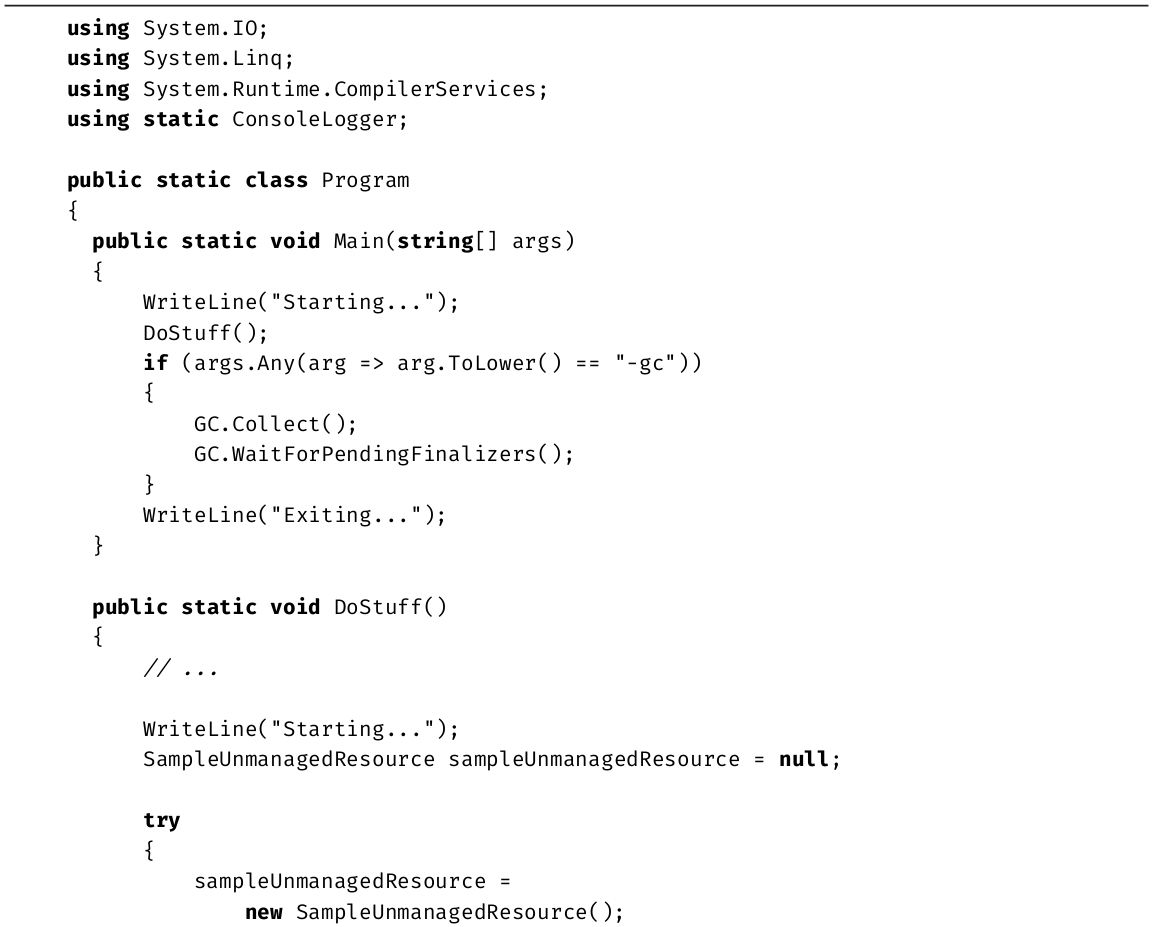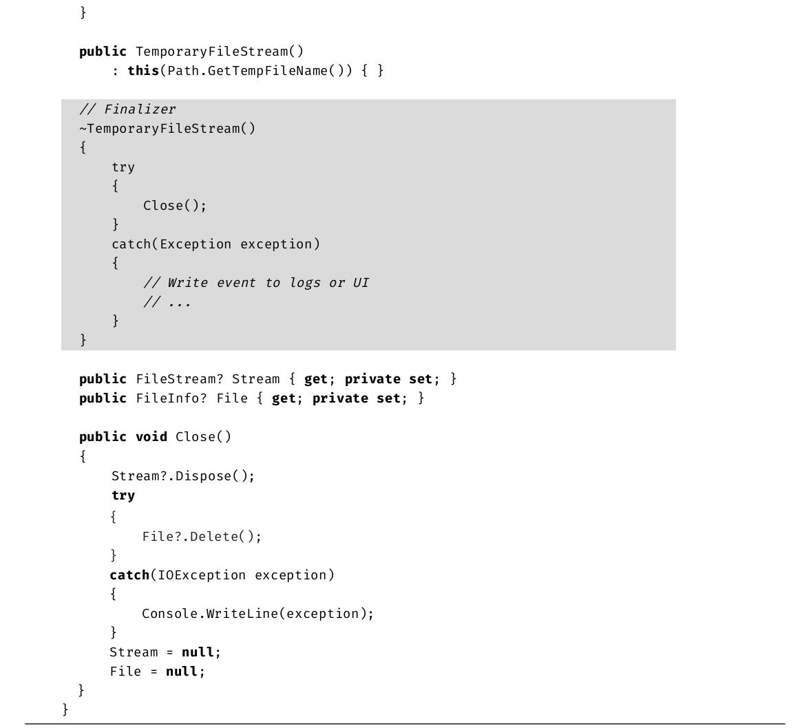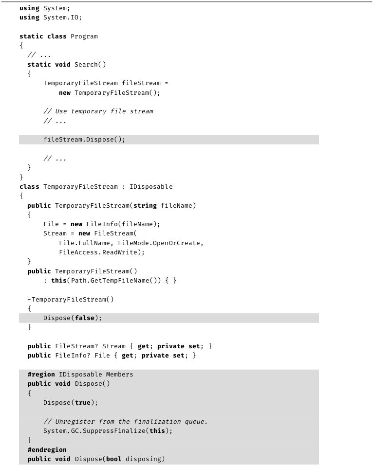 应该注意,垃圾回收器只负责内存管理。它没有提供一个自动的系统来管理和内存无关的资源。因此,如需采取显式的行动来释放资源(除内存之外的其他资源),使用该资源的程序员应通过特殊的CLI兼容编程模式来帮助清理这些资源(详情参见第10章)。