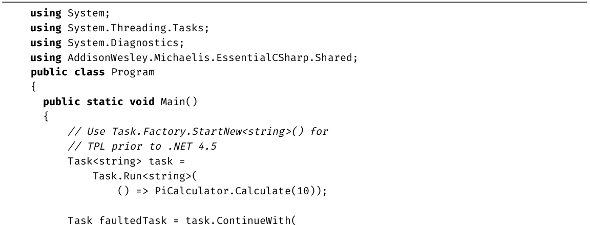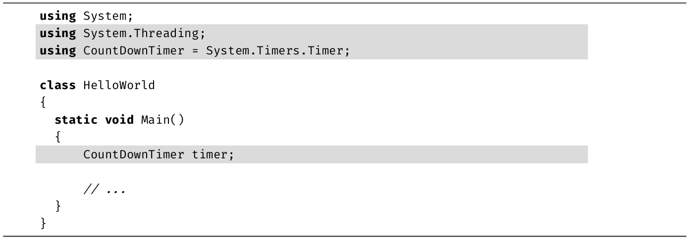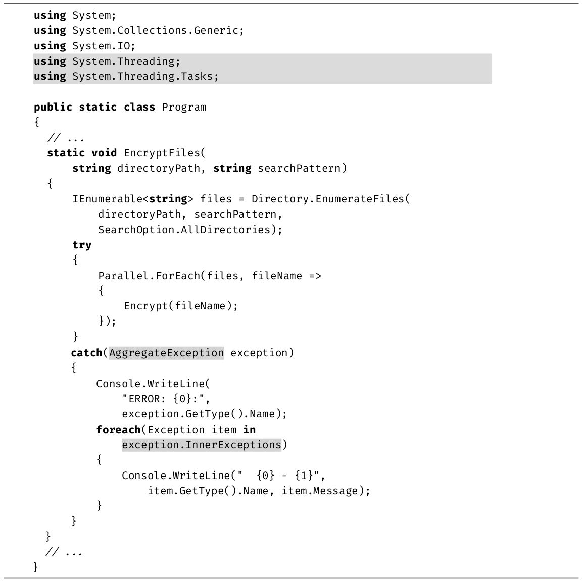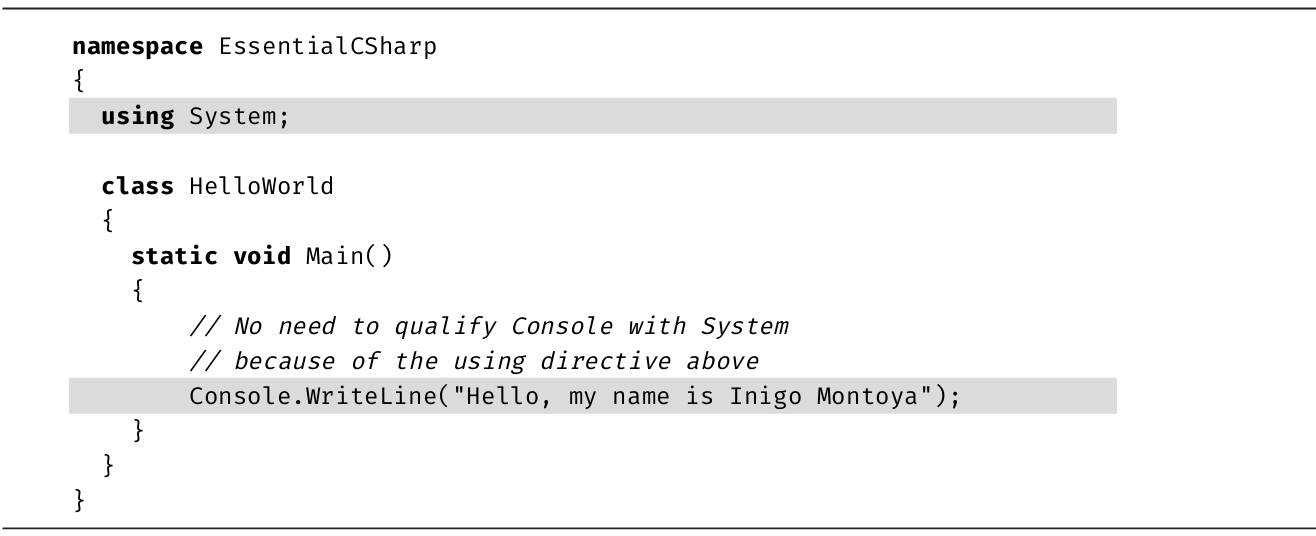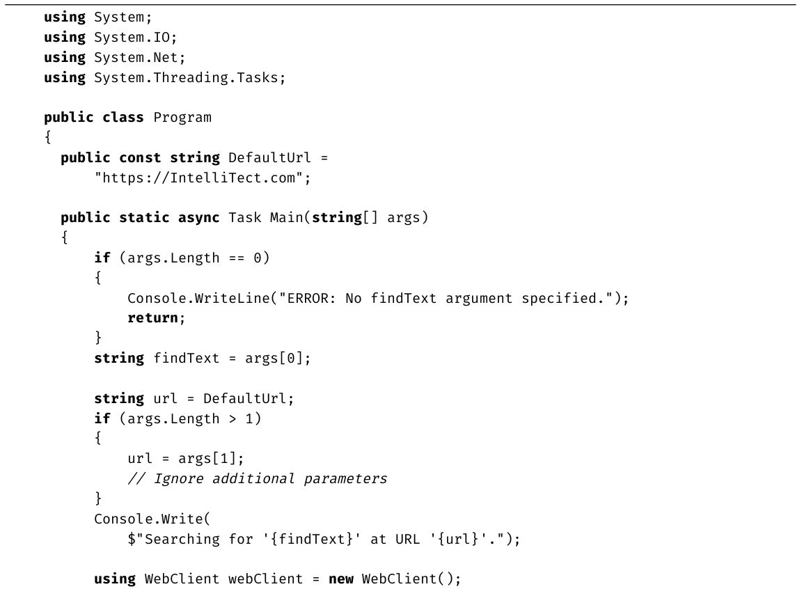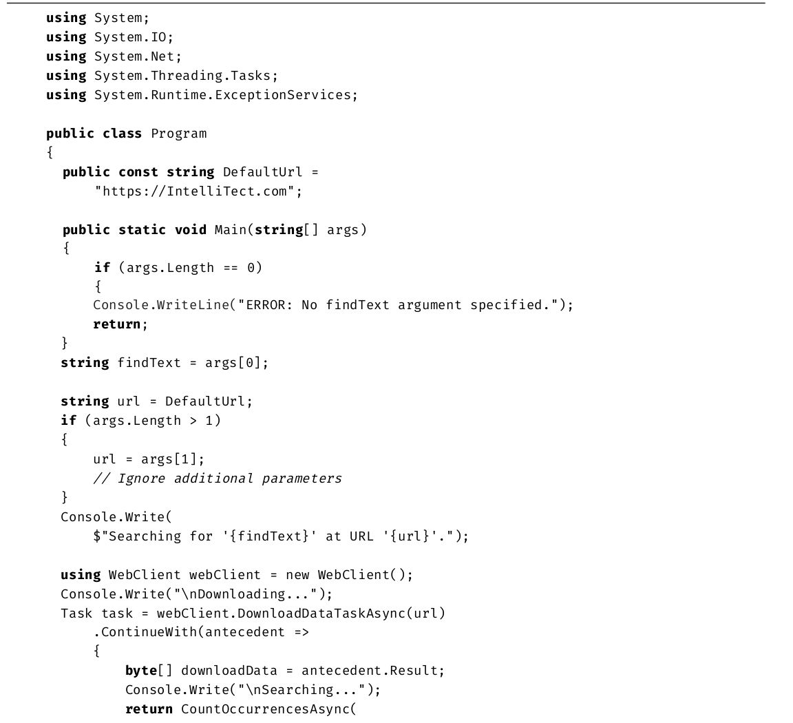 虽然我也可以在书中提供完整代码以方便复制,但这样会分散大家的注意力。因此,你需要在自己的程序中修改示例代码。书中的代码主要省略了错误检查,比如异常处理。另外,代码没有显式包含using System语句,所有例子都需要该语句。