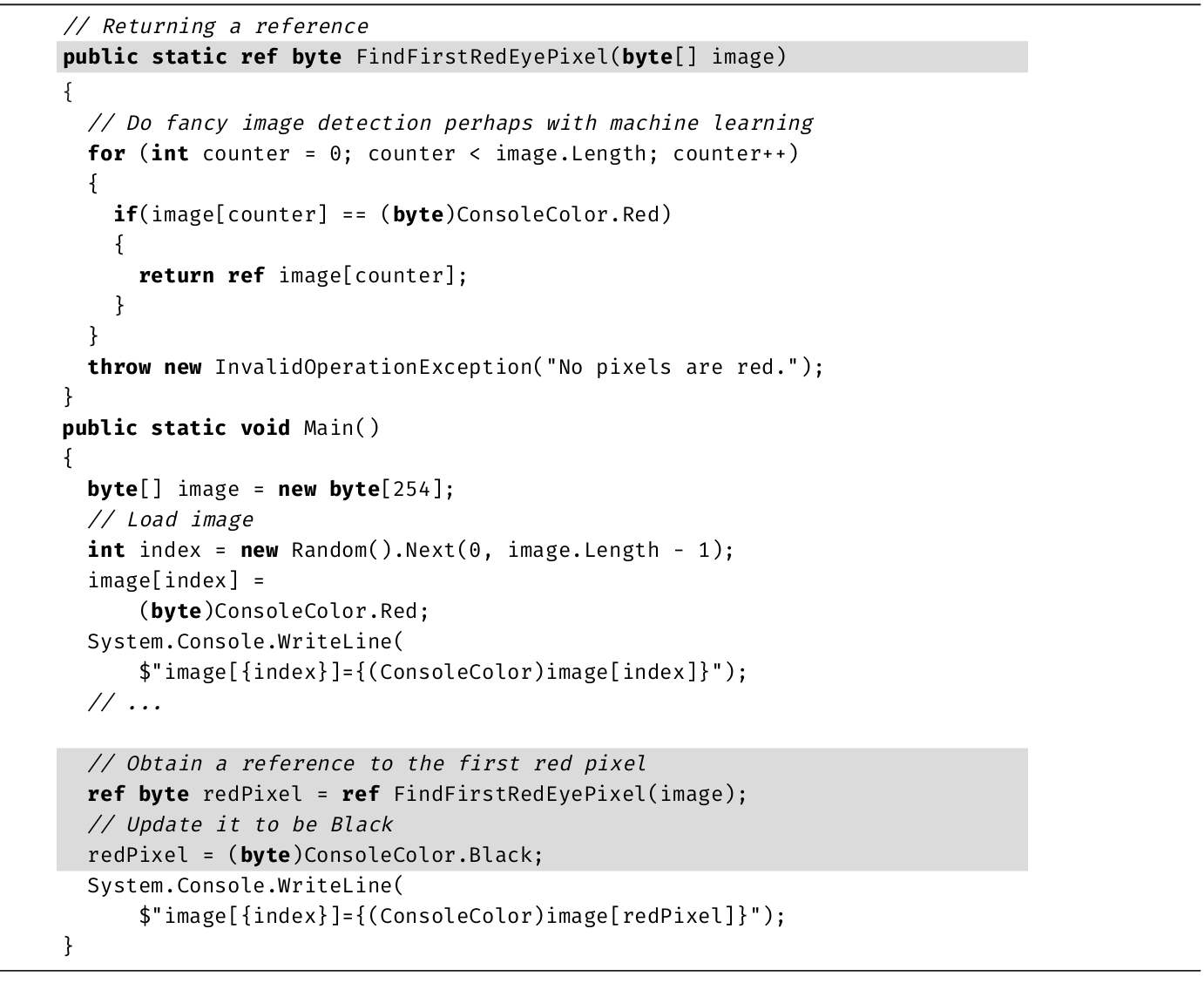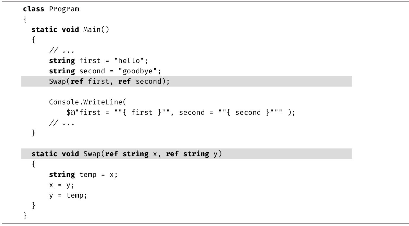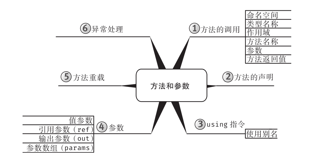 ·第5章 :本章讨论方法及其参数的细节,其中包括通过参数来传值、传引用和通过out参数返回数据。C# 4.0新增了默认参数,本章将解释如何使用。