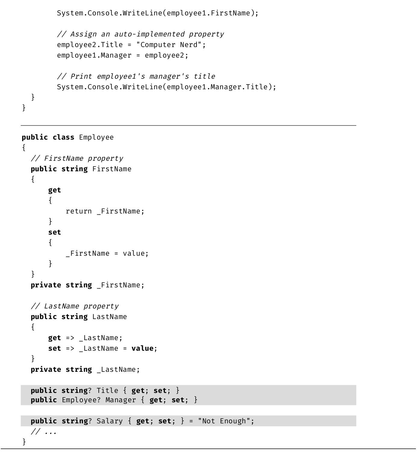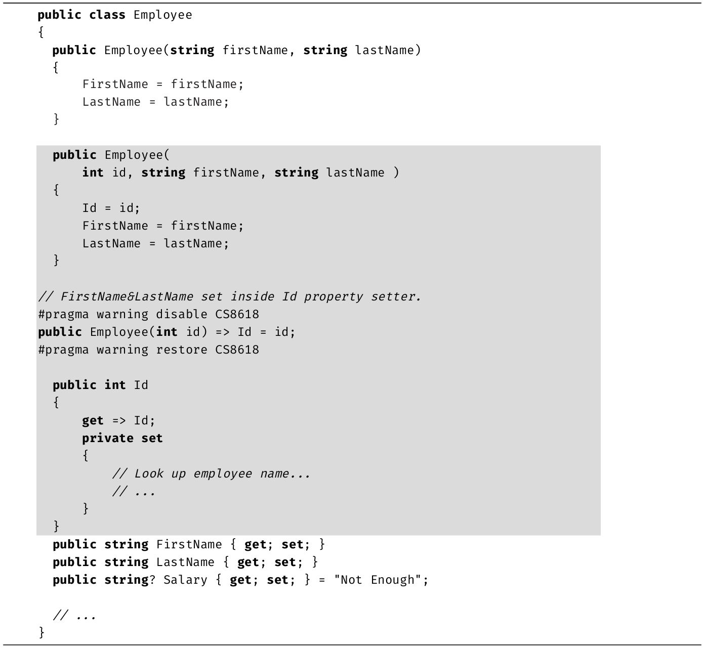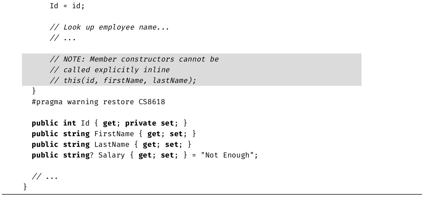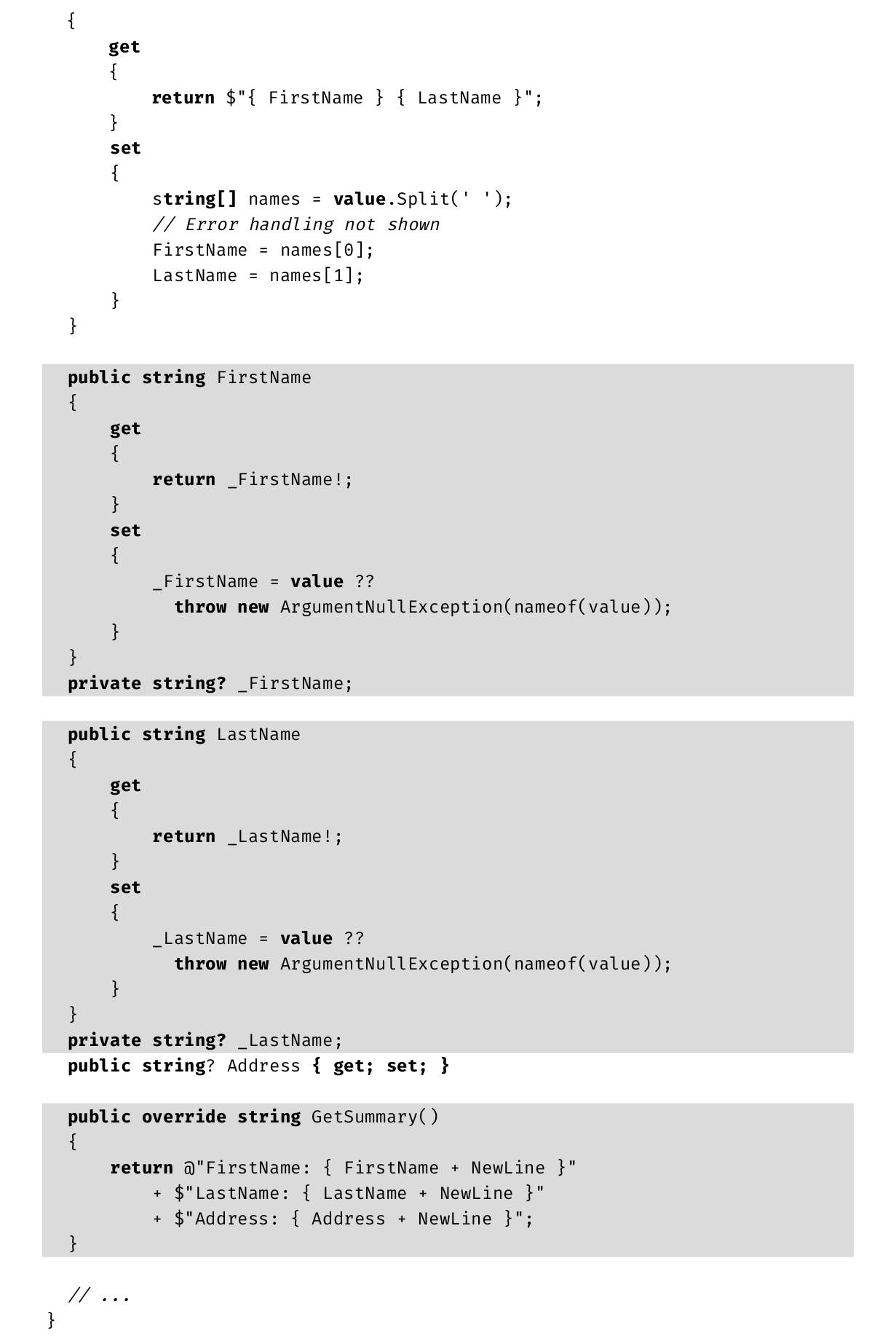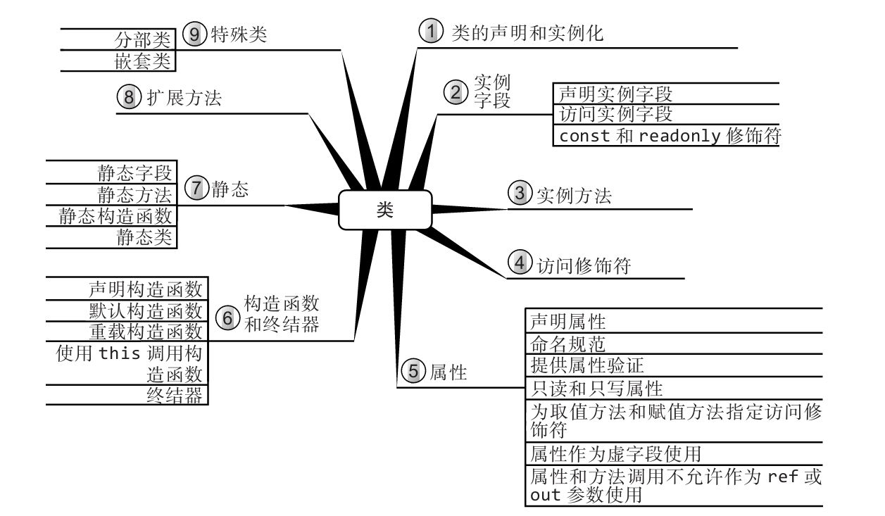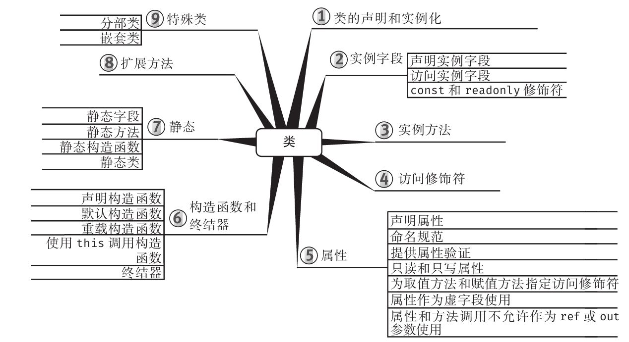 ·第6章 :前面已学过类的基本构成元素,本章合并这些构造,以获得具有完整功能的类型。类是面向对象技术的核心,它定义了对象模板。本章还包括C# 8.0中新引入的可空属性。