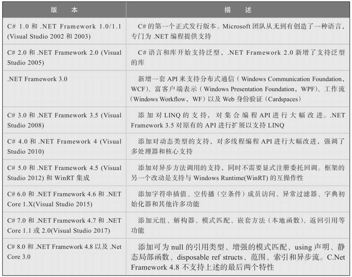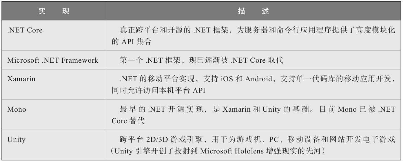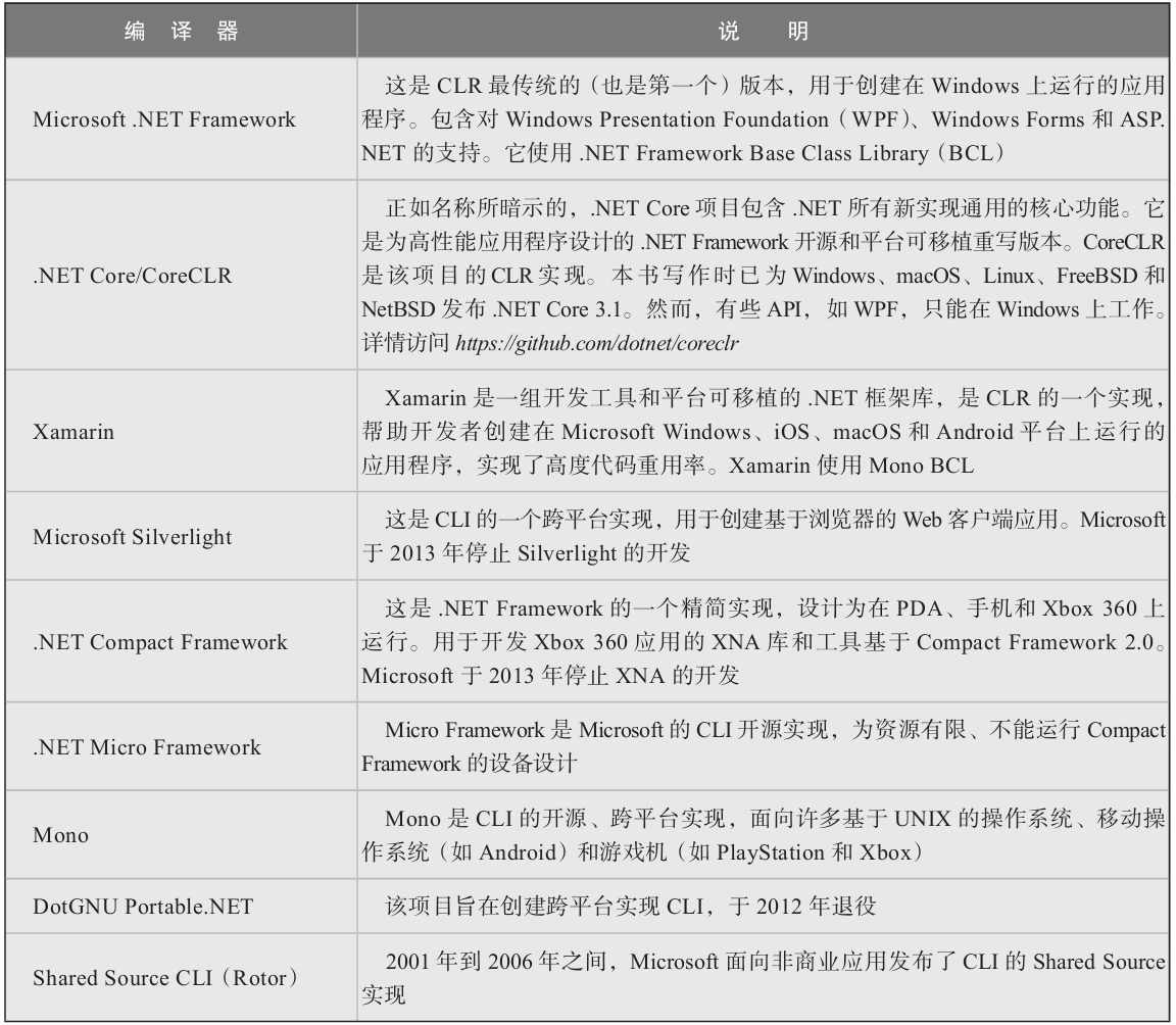 目前CLI的主要实现包括.NET Core(在Windows、UNIX/Linux和mac OS上运行)、.NET Framework for Windows和Xamarin(一个致力于跨平台的应用程序框架,目前支持iOS、mac OS和Android应用)。每个实现都包含一个C#编译器和一组框架类库。各自支持的C#版本以及库中确切的类集合都存在显著区别。另外,许多实现目前仅存历史意义。表24.1对这些实现进行了总结。