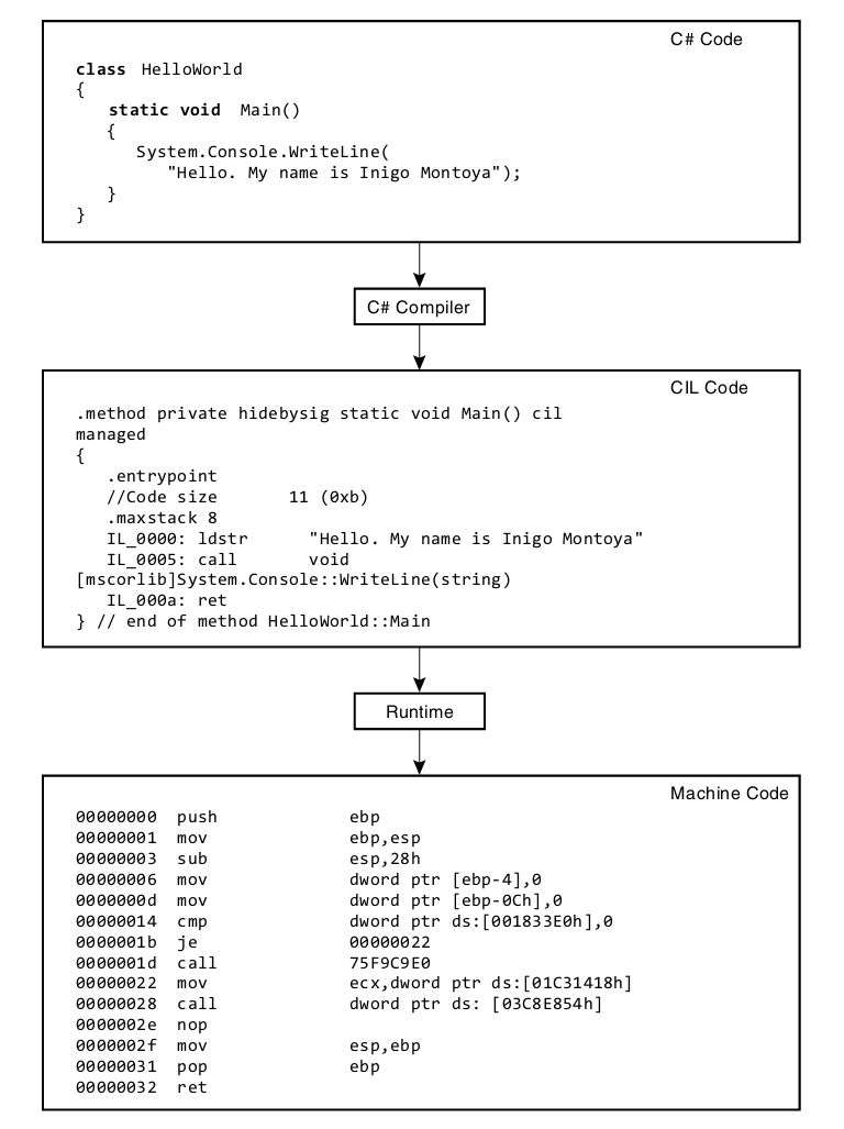 所有计算机语言都定义了编程的语法和语义。由于C和C++之类的语言会直接编译成机器码,所以这些语言的平台是底层操作系统和机器指令集,即Microsoft Windows、Linux和macOS等。但C#不同,它的底层上下文是“运行时”(或VES)。
