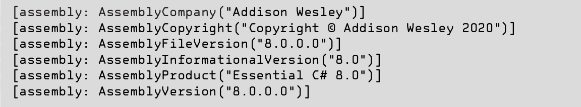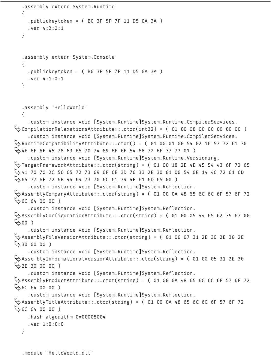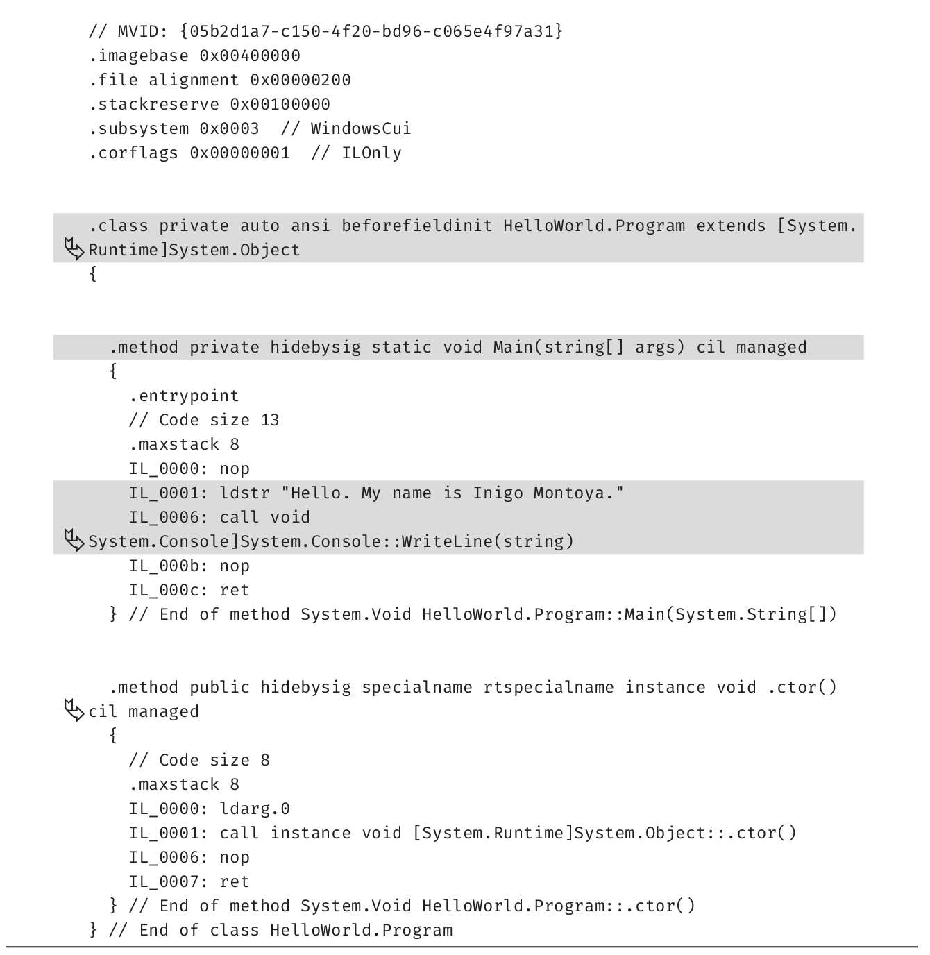除了清单,程序集还将CIL代码包含到一个或多个模块中。通常,程序集和清单被合并成一个单独的文件,就像第1章的HelloWorld.exe一样。但也可将模块单独放到它们自己的文件中,然后使用程序集链接器(al.exe)来创建一个程序集文件,其中包括对每个模块进行引用的清单 [1] 。这不仅提供了另一种手段将程序分解成单独的组件,还实现了使用多种不同源语言来开发一个程序集。