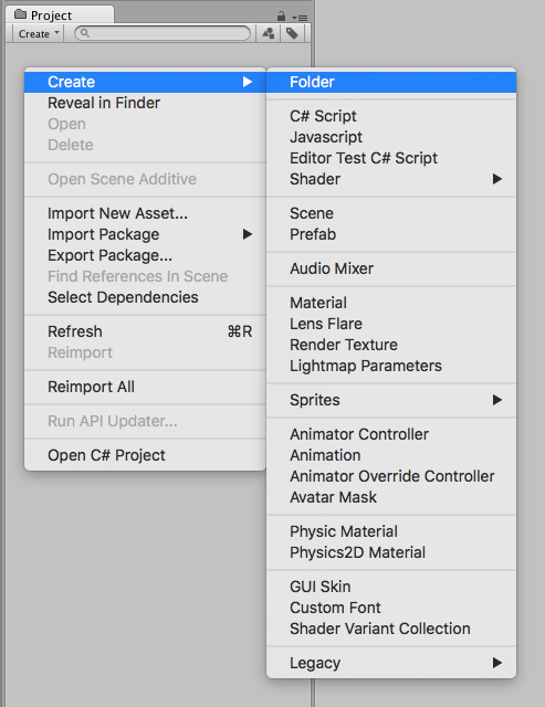 首先,创建一个新文件夹以放置需要添加到 AssetBundle 的资源。要执行此操作,请在 Project 窗口内右键单击,然后选择 Create > Folder (或单击 Project 窗口左上角的 Create > Folder )。