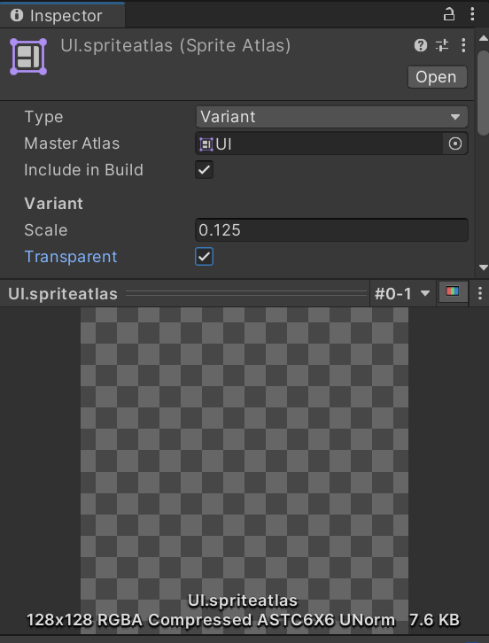 图集的 Streaming 配置与纹理资源类似,也在 Texture Streaming 页面设置,但我们使用图集的 Variant 作为 Placeholder,通过调整 Variant 的 Scale 来缩小尺寸。 在 Variant 图集的 Inspector 窗口勾选 Transparent 选项,可以使用透明贴图。