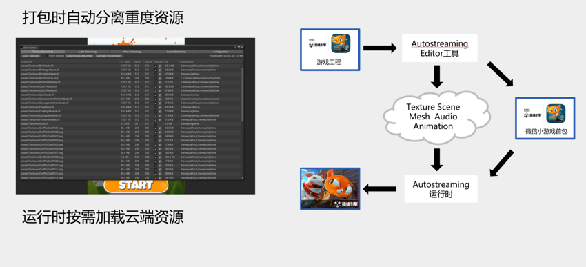 在游戏开发中,资源管理是至关重要的一环。通常,游戏中的资源占据了大部分的空间,而且在游戏启动时,只有少数资源是立即需要的。为了解决这一问题,我们引入了 AutoStreaming 技术,它能够自动按需加载资源,带来以下优势: