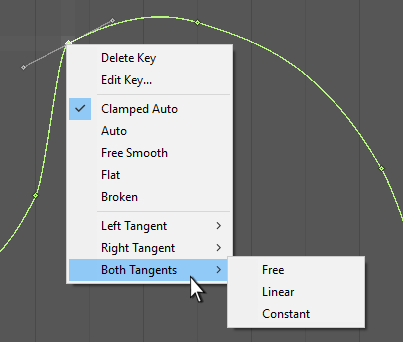 一个关键点有两条 切线 :一条在左侧用于向内的斜坡,另一条在右侧用于向外的斜坡。切线可控制关键点之间的曲线形状。可从许多不同的切线类型中进行选择一种类型,用于控制曲线离开一个关键点并到达下一个关键点的方式。右键单击一个关键点可以选择该关键点的切线类型。