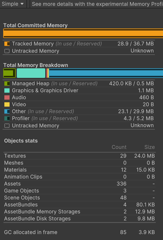 由于小游戏平台没有真实的文件系统,加载 AssetBundle 时往往会带来 AB 文件大小 2–3 倍的开销。因此我们添加了 AssetBundle 内存统计,便于查看各个 AB 内存占用情况,用于分析 AB 加载逻辑是否合理。