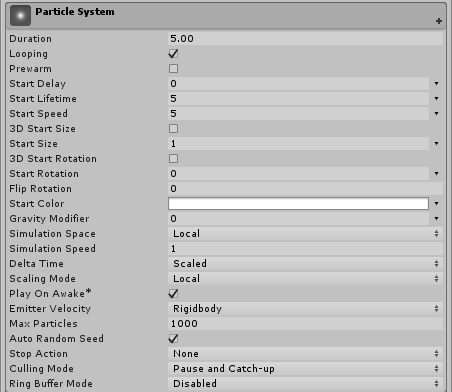 | Emitter Velocity | Choose how the Particle System calculates the velocity used by the Inherit Velocity and Emission modules. The system can calculate the velocity using a Rigidbody component, if one exists, or by tracking the movement of the Transform component. If no Rigidbody component exists, the system uses its Transform component by default. |