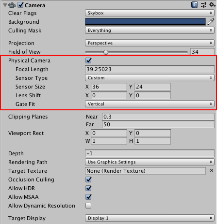摄像机组件的 Physical Camera 属性在 Unity 摄像机上模拟真实摄像机格式。这可用于从同样模拟真实摄像机的 3D 建模应用程序导入摄像机信息。
