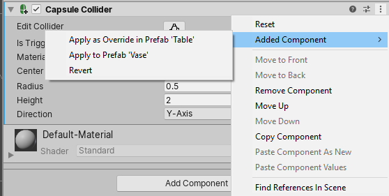 在我们的示例中,如果选择 Apply to Prefab ‘Vase’ ,且“Table”预制件具有该值的覆盖,则“Table”预制件中的此覆盖将同时恢复,使实例上的属性保留刚应用的值。如果不是这种情况,则实例上的值将在应用后立即更改。