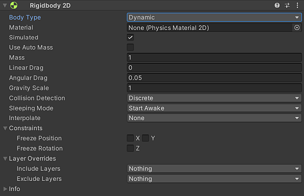 Body Type Select to set the movement behavior and Collider 2D interaction of this Rigidbody 2D’s component settings.