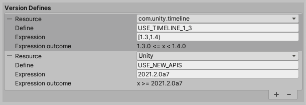 If you need to compile different code in an assembly according to whether a project uses specific versions of Unity or of a package, you can add entries to the Version Defines list. This list specifies rules for when a symbol should be defined. For version numbers, you can specify a logical expression that evaluates to a specific version or a range of versions.