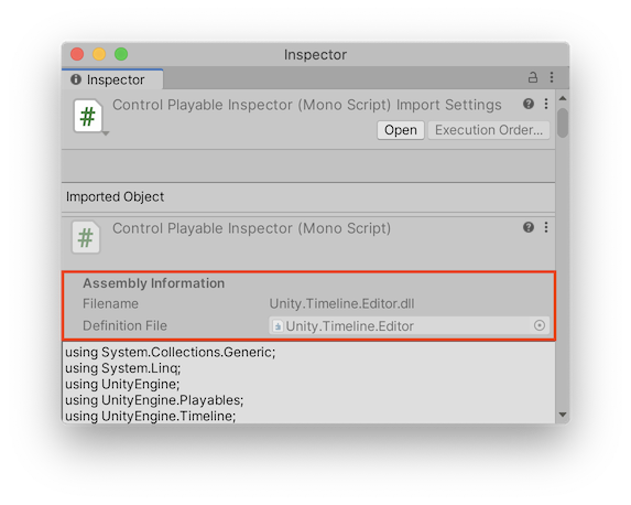 在此示例中,选定脚本会编译到库文件 Unity.Timeline.Editor.dll 中,该文件由 Unity.Timeline.Editor 程序集定义资源进行定义。