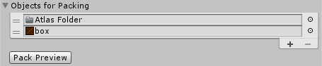 The Objects for Packing list displays the currently selected items that are in the Sprite Atlas. You can place Texture2D and Sprite Assets in this list. Drag and drop a folder directly onto the list to automatically add all valid content within the folder to the list (only the folder appears on the list).
