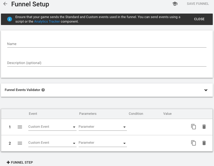 注意:在单击 Save 之后,无法修改漏斗图步骤。但是,可创建漏斗图副本并修改副本的步骤。此限制的原因是,更改现有漏斗图的规则会使该漏斗图中包含的任何现有数据无效。