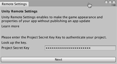 输入 Analytics 项目的 Project Secret Key ,然后单击 Next 。 您可以在 Unity Analytics Dashboard 的 Configure 页面下找到自己的 Project Secret Key