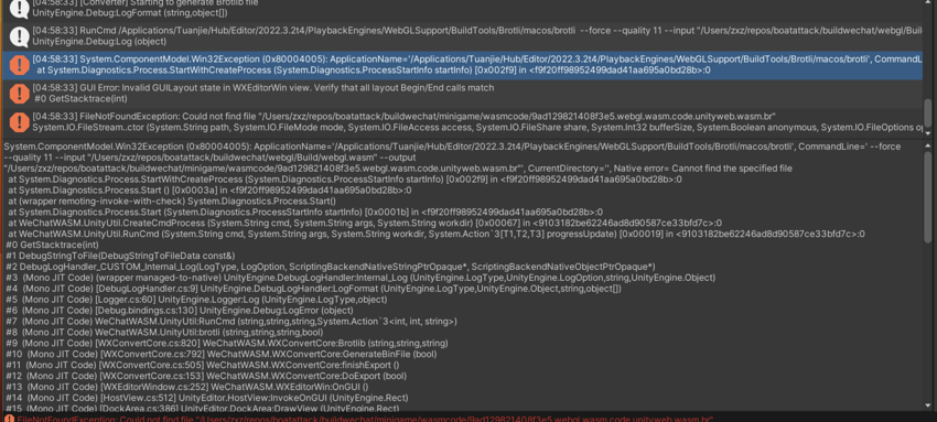 若出现下图报错:由于早期微信SDK版本中调用了WebGL平台下的brotli压缩工具,因此安装团结引擎微信小游戏平台时,请同时安装WebGL平台。最新版本已解决此问题。