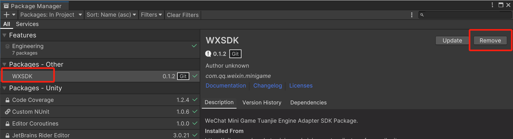 Tuanjie 1.1.0 的 WeixinMiniGame 平台中,自带的小游戏转换插件和当前项目不兼容,需要将其卸载的同时删除 Assets 下的 WebGLTemplates 和 WX-WASM-SDK-V2 ,并安装旧版的 SDK ,请下载 SDK package 导入到工程中。