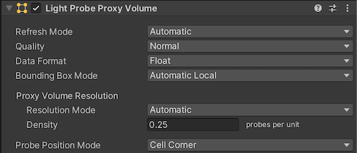 包围体内的插值光照探针的数量受 Proxy Volume Resolution 属性的影响。有两个选项: