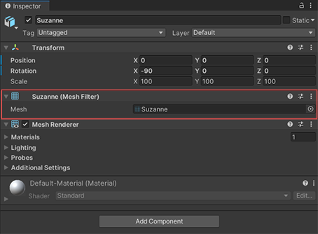 注意:当更改 Mesh Filter 组件引用的网格时,此游戏对象上其他组件的设置不会改变。例如,Mesh Renderer 组件不会更新其设置,这可能会导致 Unity 使用非预期的属性渲染网格。如果发生这种情况,请根据需要调整其他组件的设置。