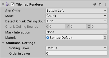 Tilemap Renderer 组件是 Tilemap 游戏对象的一部分。它确定 Tilemap 上设置的 Tiles 的渲染方式。