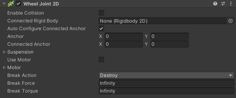 Unlike the Wheel Collider used with 3D physics, the Wheel Joint 2D uses a separate Rigidbody object for the wheel, which rotates when the force is applied. (The Wheel Collider, by contrast, simulates the suspension using a raycast and the wheel’s rotation is purely a graphical effect). The wheel object will typically be a Circle Collider 2D with a Physics Material 2D that gives the right amount of traction for your gameplay.