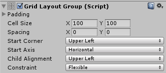 与其他布局组不同,网格布局组会忽略其包含的布局元素的最小大小、偏好大小和灵活大小属性,而是为所有这些元素分配固定大小,此大小则由网格布局组本身的 Cell Size 属性进行定义。