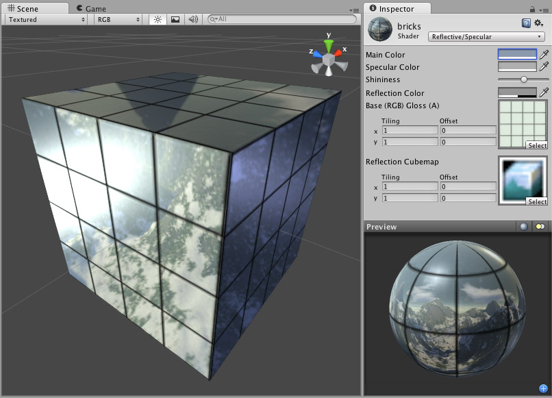 此着色器将模拟反射表面,如汽车、金属物体等。它需要一个环境立方体贴图来定义具体的反射。主纹理的 Alpha 通道定义了对象表面上的反射强度。任何场景光源都会在反射对象上增加亮度。