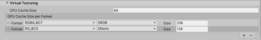 在渲染具有使用该格式纹理的纹理堆栈的材质时,虚拟纹理会为给定图形格式分配 GPU 缓存。您可以在 HDRP 资源上配置缓存大小(以 MB 为单位),它允许您为每个质量级别设置不同的配置。