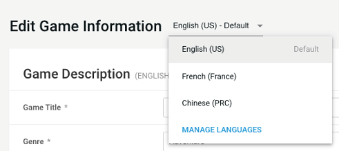 可为每种支持的语言指定元数据。要添加新语言,请在编辑模式下选择语言下拉选单,然后选择“管理语言”。