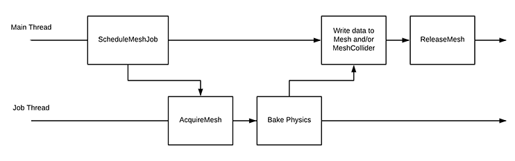 如果向 GenerateMeshAsync 提供 MeshCollider,则 Unity 也会计算 MeshCollider 的加速结构(上图中的“Bake Physics”)。这对于大型网格而言可能十分耗时,因此它也会在工作线程上发生。