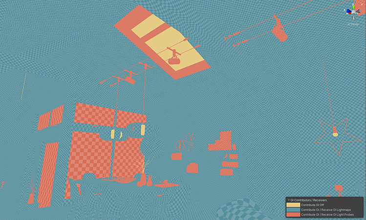 此绘制模式根据网格渲染器和地形的 Static Editor Flags 中的 ContributeGI 是否已启用,以及其 ReceiveGI 属性的值,用不同颜色绘制网格渲染器和地形。