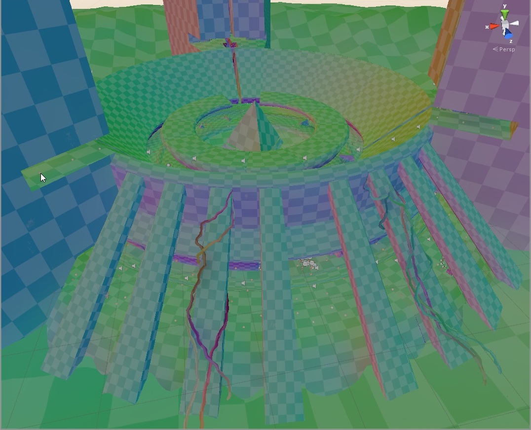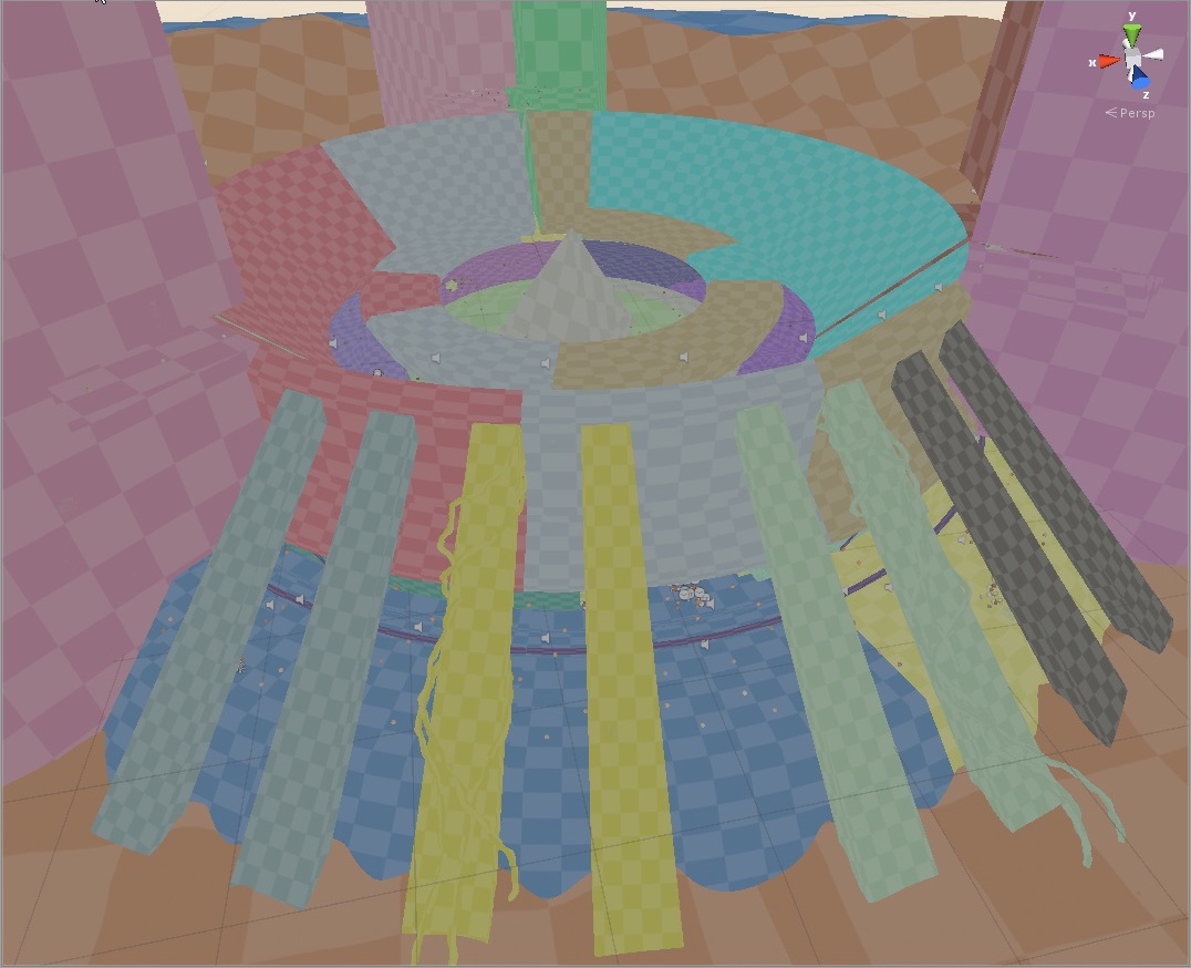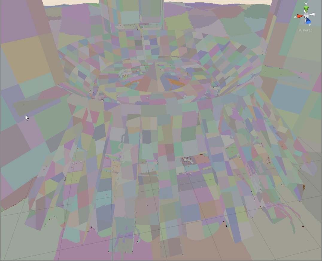 此选项显示在计算预计算实时全局光照时使用的优化 UV 布局。这是预计算过程中自动生成的。完成了实例预计算阶段便立即可用。UV Charts 的 Scene 视图模式可以帮助您识别需要调整 UV 或缩放的几何体(使用光照贴图参数中的 Resolution 参数来更改比例)。调整实时分辨率时,此视图也很有用。每个图表的颜色不同。