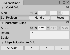 使用 Set Position 可将网格移动到所选游戏对象的手柄 (Handle) 或回到默认位置 (Reset)。