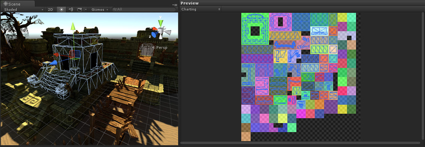 • 所选实例的 UV 放置在图表上,同时网格的线框表示了相应的游戏对象。