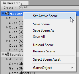 Set Active Scene | This allows you to specify which scene new Game Objects are created/instantiated in. There must always be one scene marked as the active scene |