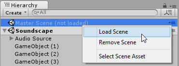 场景存在于层级视图中时,可加载或卸载场景以显示或隐藏每个场景中包含的游戏对象。此操作与在 Hierarchy 窗口中添加和删除场景的操作不同。