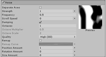 Damping | 启用此属性后,强度与频率成正比。将这些值绑在一起意味着可在保持相同行为但具有不同大小的同时缩放噪声场。 |
