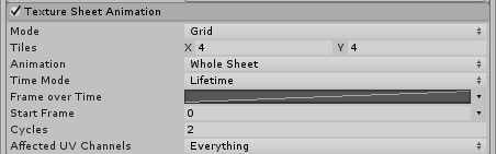动画 (Animation) | Animation 模式可设置为 Whole Sheet 或 Single Row__(即精灵图集的每一行代表一个单独的动画序列)。 | | Time Mode| 选择粒子系统如何在动画中对帧进行采样。 | | Lifetime| 在粒子的生命周期内使用动画曲线对帧进行采样。 | | Speed| 根据粒子的速度对帧进行采样。速度范围指定选择帧的最小和最大速度范围。 | | FPS| 根据指定的每秒帧数值对帧进行采样。 | | Row Mode| 使粒子系统从纹理帧中选择一行以生成动画。仅当 Animation__ 模式设置为 Single Row 时,此属性才可用。 |