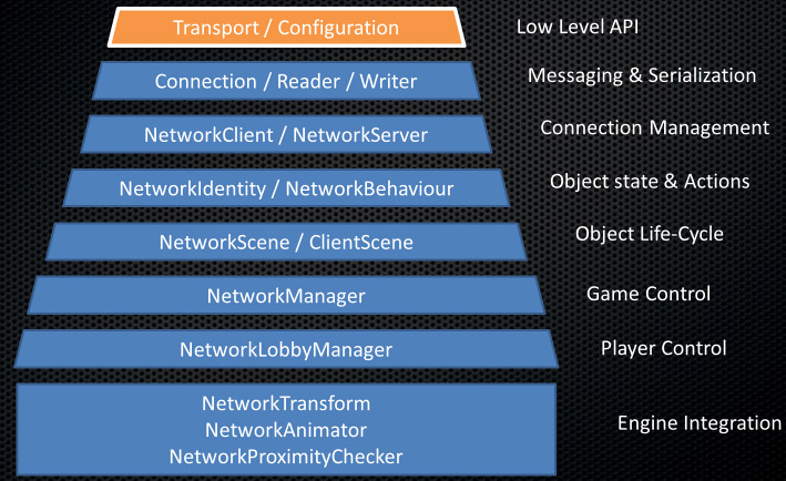 Unity 的多玩家高级 API (HLAPI) 是用于为 Unity 游戏构建多玩家功能的系统。该系统基于低级传输实时通信层,可处理多人游戏所需要的大部分常见任务。尽管传输层支持任何类型的网络拓扑,但 HLAPI 是一种服务器授权系统;虽然 HLAPI 允许其中一个参与者同时是客户端和服务器,因此不需要任何专用服务器进程。通过与互联网服务结合使用,开发者只需要进行很少的工作即可实现基于互联网的多人游戏。