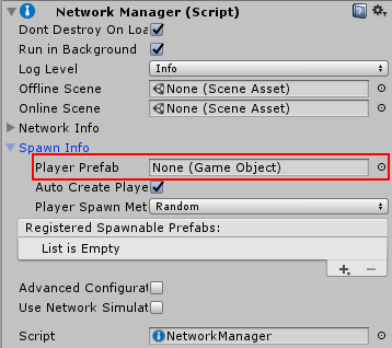 5.在 Inspector 中,将玩家预制件添加到 Network Manager 的 Player Prefab 属性。