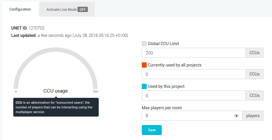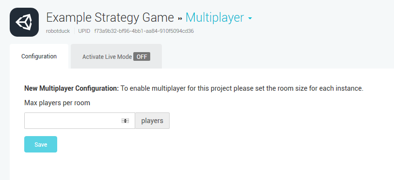 如果还没有为项目设置 Multiplayer 服务,则会提示设置__新的多人游戏配置 (New Multiplayer Configuration)。为此,请输入希望每个房间拥有的玩家数量,然后单击 Save__。